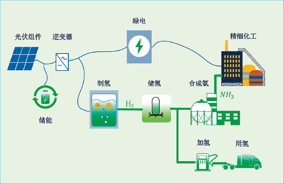與新能源電站配套,實現綠電直接制氫,以綠氫作為原料合成液氨,再用于精細化工產業(yè)建設零碳園區(qū),實現氫能重卡、叉車等氫能綜合利用。